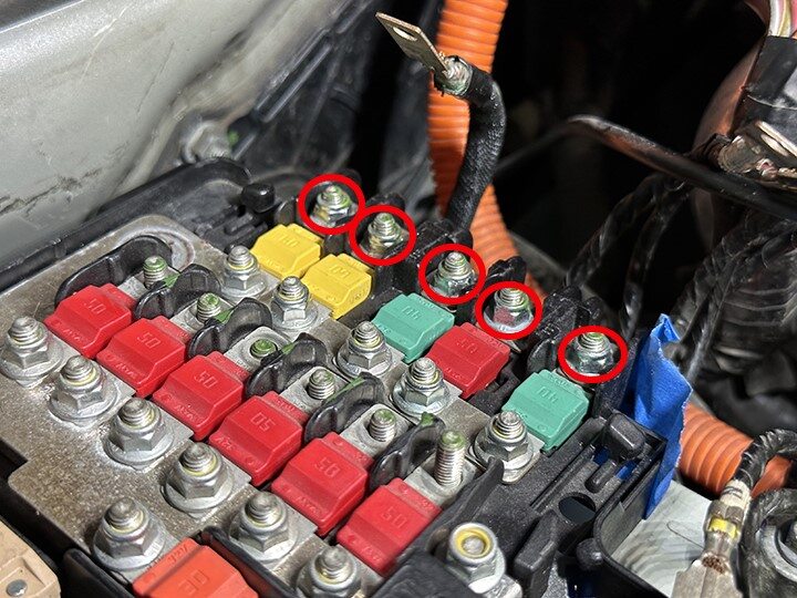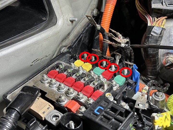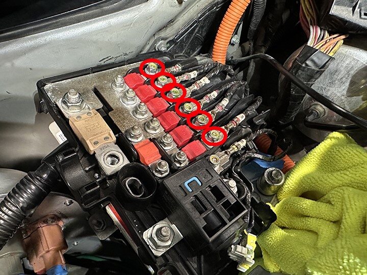 Torque nuts securing front harness upper wire terminals to 12V battery fuse box