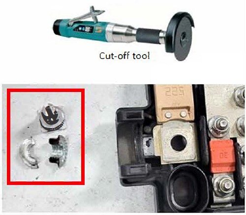 NoteIf nut is not cross-threaded then skip this step, Cover fuse box with shop towel to protect from debris, Vacuum debris as needed, Make sure to wear proper PPE for cutting, Do not breathe in fumes