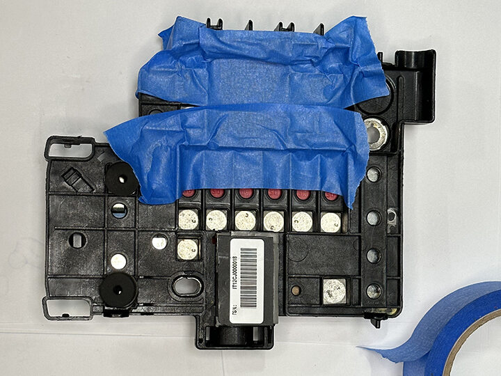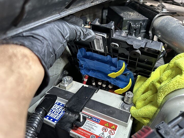 Remove masking tape from 12V battery fuse box studs
