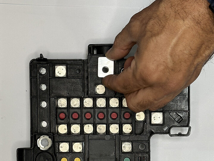 Position aluminum insert onto 12V battery fuse box