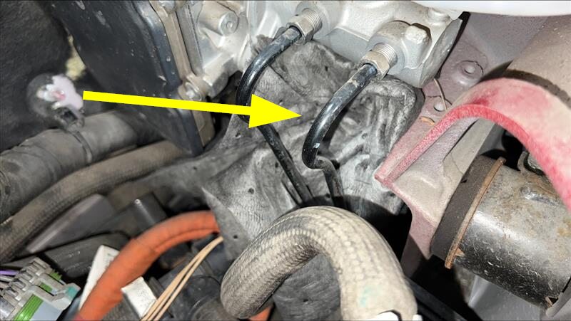 Remove AC line bracket bolt on RH shock
