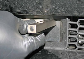 If the vehicle was built through August 20, 2017, use the bubble tool to check vertical alignment. If the bubble is not centered between the lines on the long side of the bubble tool, adjust the vertical alignment screw until the bubble is centered: