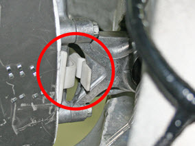 - Release the clip that attaches the coolant hoses to the rear subframe.