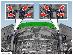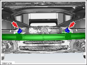 NoteIf necessary, remove the screws (x4) that secure the RH sub-cool condenser mounting clamps (torque 3 Nm) in order to access the lower outboard bolt that secures the RH side of the bumper to the crash structure.