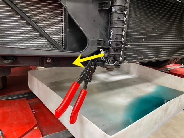 - Release the coolant hose clamps from the LH and RH radiator hose.