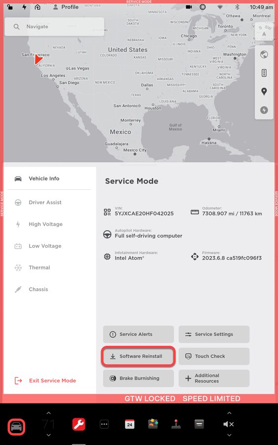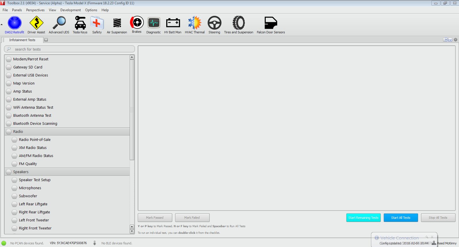 Note1x connector, 2x clips, Remove cubby under MCU and connect laptop to vehicle, Open Toolbox 3 website and establish connection to vehicle: https://toolbox.teslamotors.com, Select connection status icon at top right corner and select Connect Locally (icon will turn green when vehicle is connected), Local connection will enable service mode plus on display