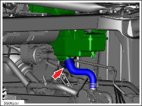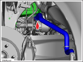 - From the LH wheelwell (RH for RHD), clamp the hose from the powertrain coolant pump to the rocker hose. Ensure that the clamp is placed just outside of the spring clamp.