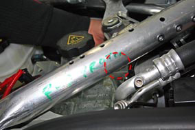 - For RHD vehicles: release the bolt that secures the coolant reservoir upper bracket to the strut brace (torque 5 Nm).