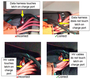 - When reinstalling the cable connector, ensure that the HV cables and data harness do not touch or interfere with the latch on the inside of the charge port.