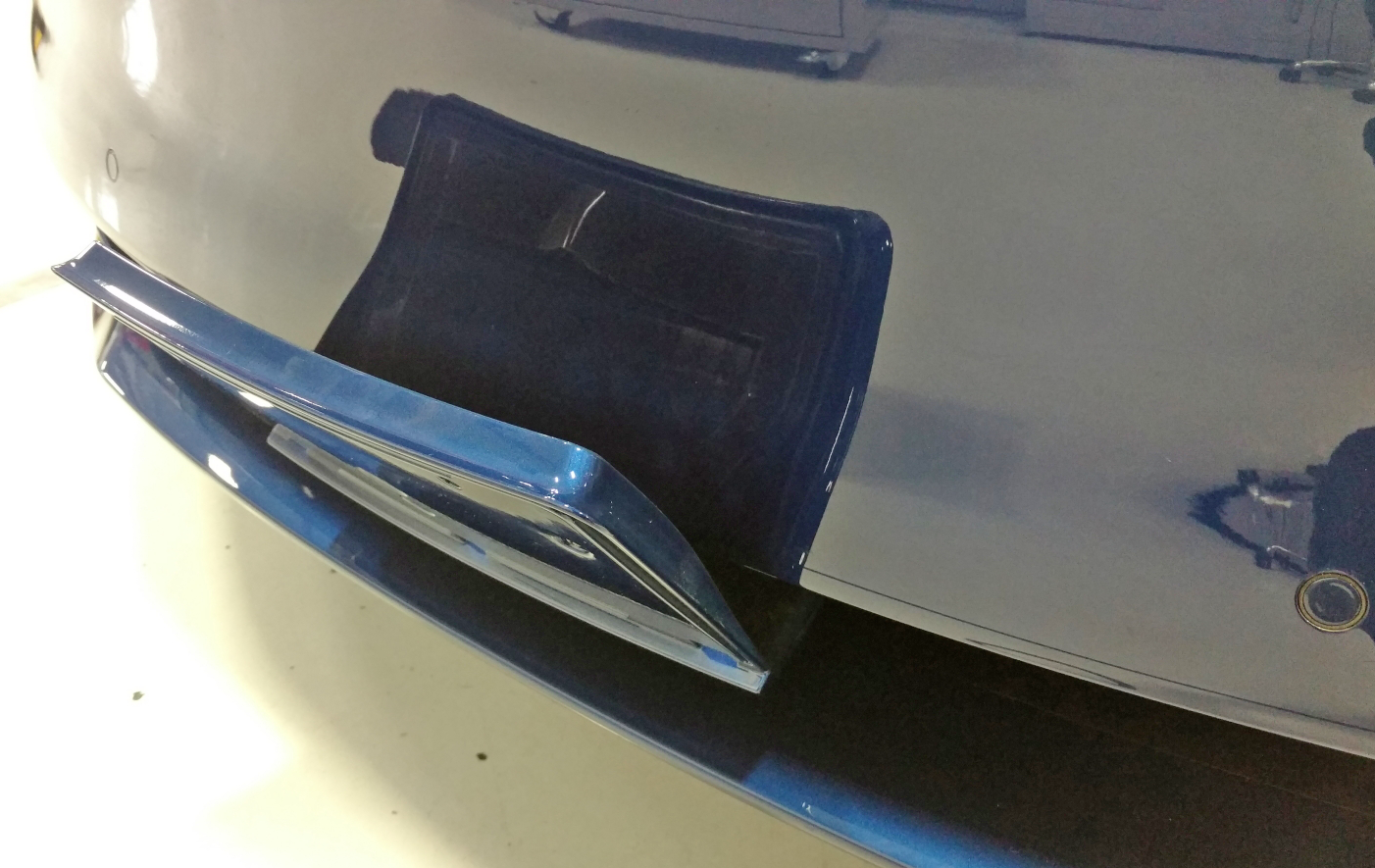 - Making sure the bracket is aligned and lifted up against the front fascia, press the front license plate bracket assembly against the front fascia. Fully wet out the adhesive on the back of the bracket assembly.
