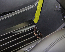 - On both sides of the vehicle, insert the curved end of the tool under the rear of the floor finisher so the taped side presses against the center console.
