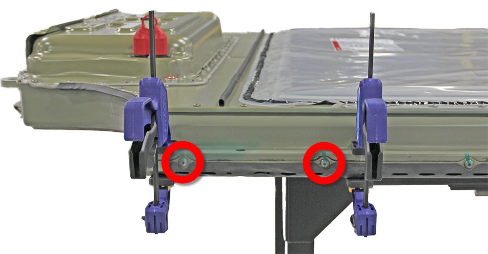 Release the clamp closest to the front of the HV battery and move it adjacent to the next remaining front bolt.