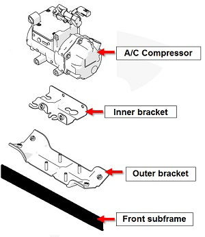NoteThe compressor mounts to an inner bracket, which attaches to an outer bracket. The outer bracket mounts to the front subframe.
