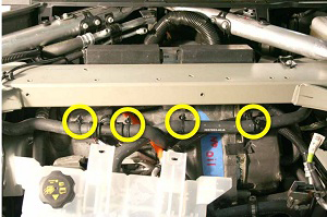 - Gently pull down on the 2 coolant hoses to release the clips (x4) that secure them to the front crossmember.