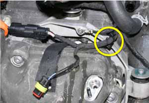 - Remove the bolt that secures the ground wire to the compressor (torque 9 Nm). Release the ground wire.