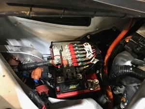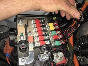 - Remove the nut (torque 12 Nm) that attaches the DCDC 12V positive terminal to the battery fuse box.