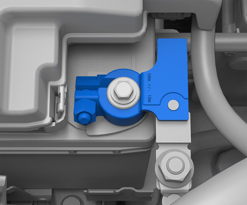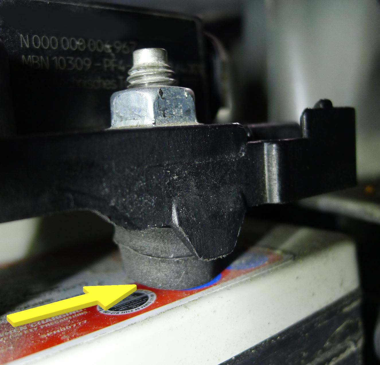 NoteThe thread pitch of this nut is specific for this terminal and should not be mixed up with the 13mm nut for the nearby body harness 12V positive terminal.