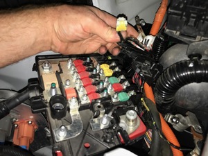 NoteMake a note of the orientation of the front harness wires at the fusebox.Tip: To prevent the bolts from falling out of their respective terminals during fuse box removal, put the nuts back on one by one after the respective wire terminal has been removed.