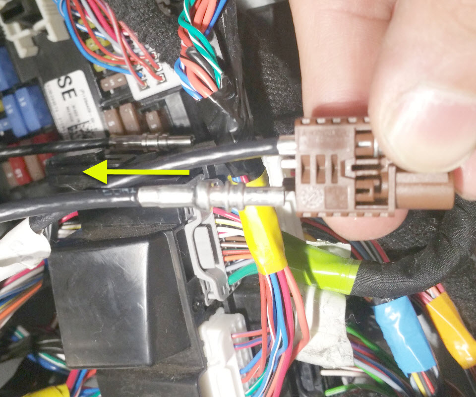 - Use the pin drag kit to carefully lift the locking tab of cavity 1 on connector X846M, and at the same time, pull the old coax cable from the connector.