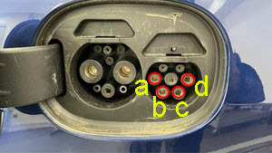 8. Use the multimeter to check voltages at the lower 4 terminals of the charge port Type 2 connector.
