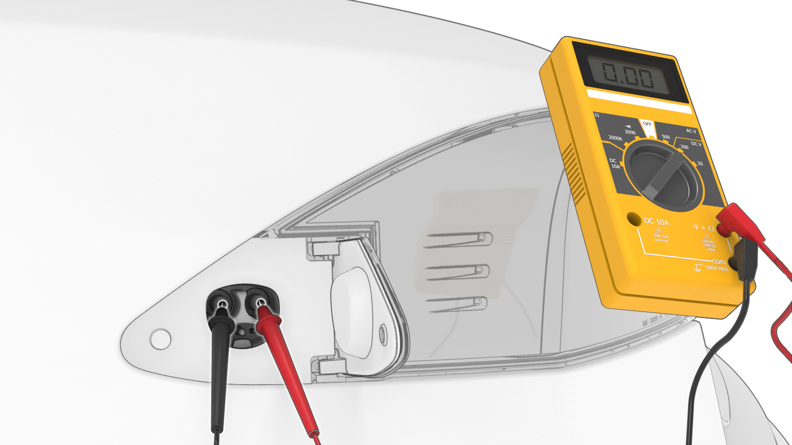 4. Set the multimeter to measure DC voltage, touch the probes to the 12V auxiliary battery terminals, and verify that the mulitimeter displays a voltage of 10 to 14 volts.