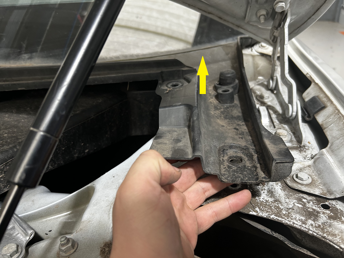 CAUTIONTake care not to scratch the hood and fenders.CAUTIONCarefully bend the cowl screen panel to move it past the hood strut.NoteThe rubber washers that are located between the wiper spindles and the cowl screen panel can stick to the panel as it is removed, then fall off the panel without being noticed. Collect the washers as the panel is removed and reinstall them on the wiper spindles.