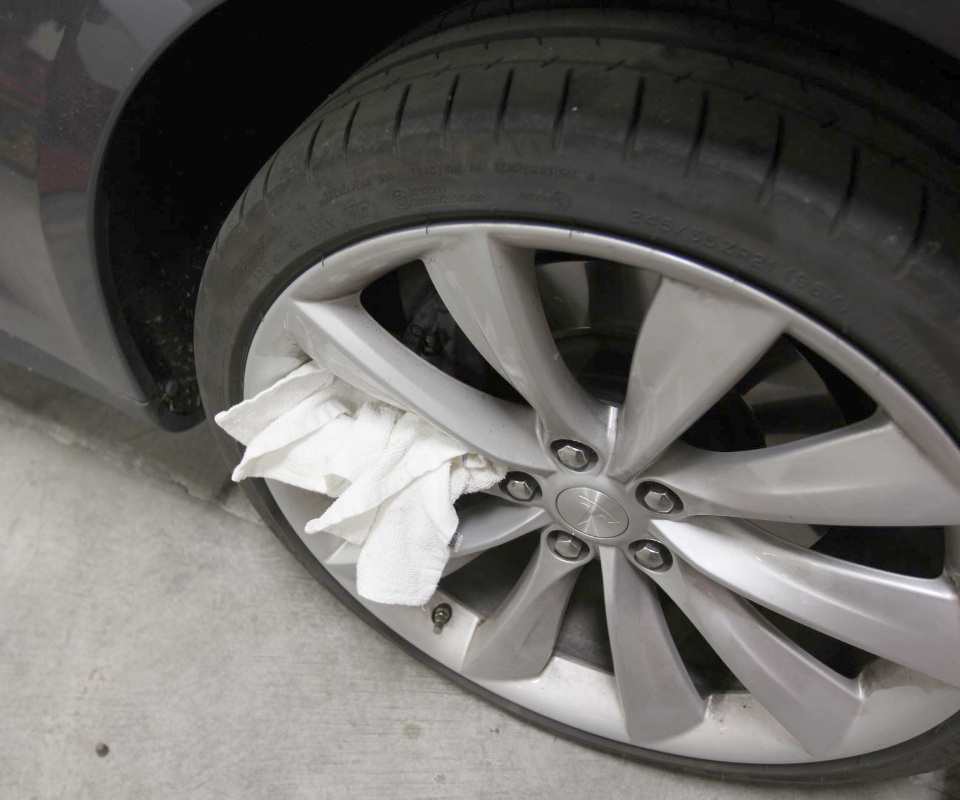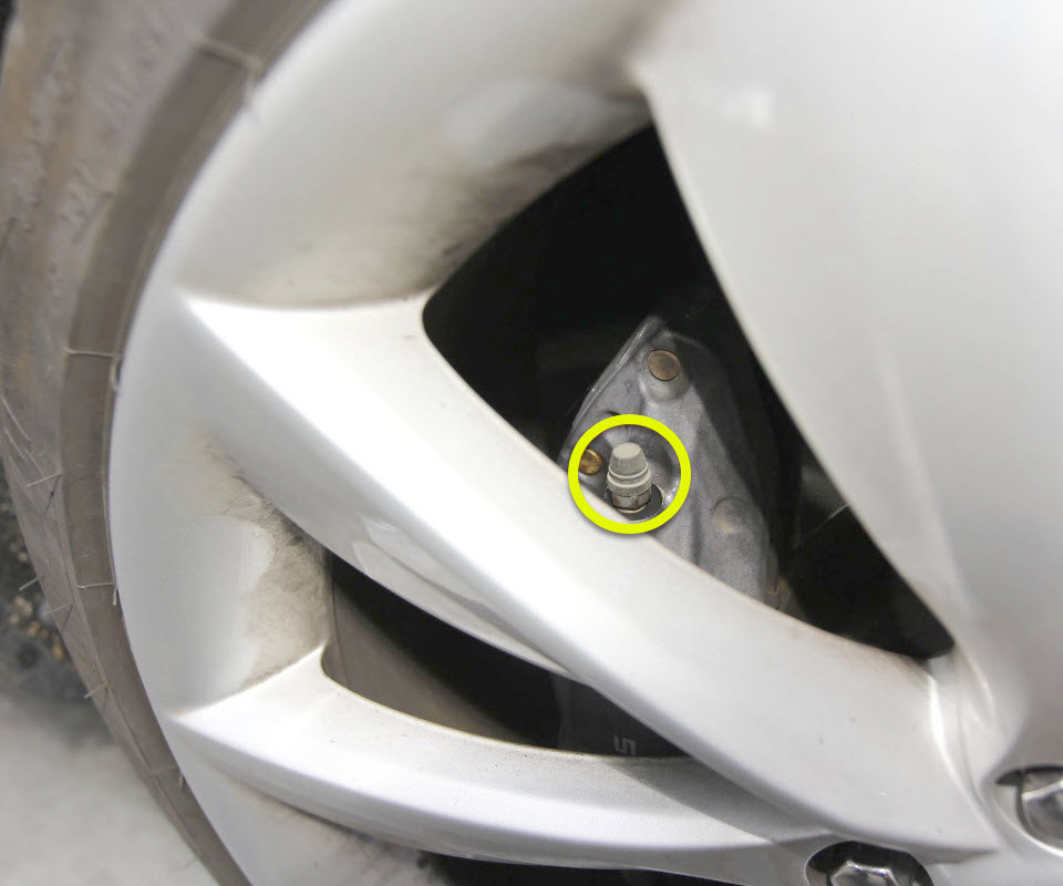 - Position a shop towel over the wheel spokes so as to protect from brake fluid.