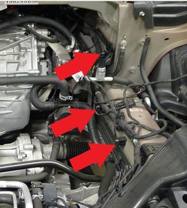 NoteSlide the lines underneath the A/C lines and coolant hose. Rotate upside down, gently pull up and out while guiding the brake lines between the coolant and A/C lines.