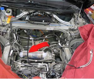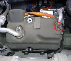 - Release the bolts (x4) that secure the coolant reservoir to the front crossmember (torque 6 Nm). Do not remove the reservoir at this time.