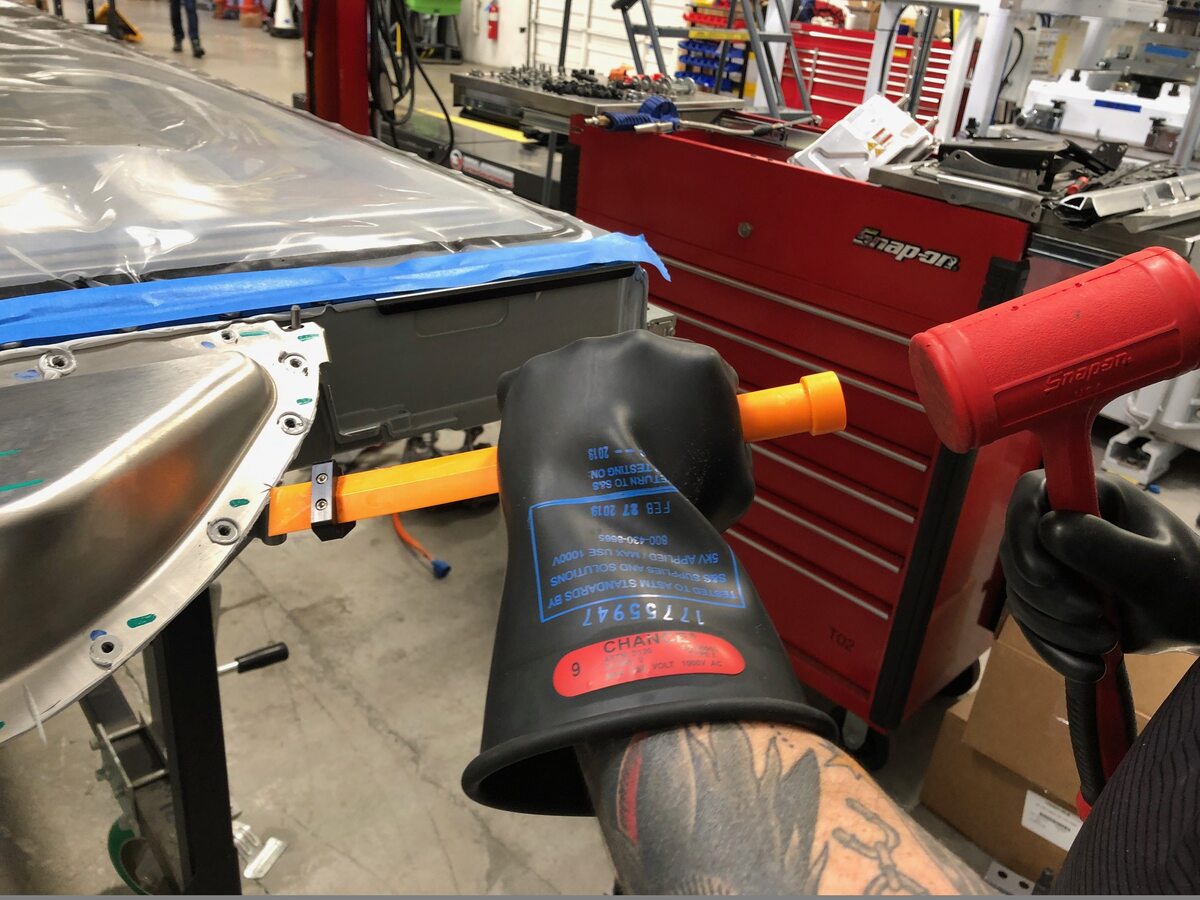 Loosely install new front HV battery bolts (x4) with a battery powered drill.