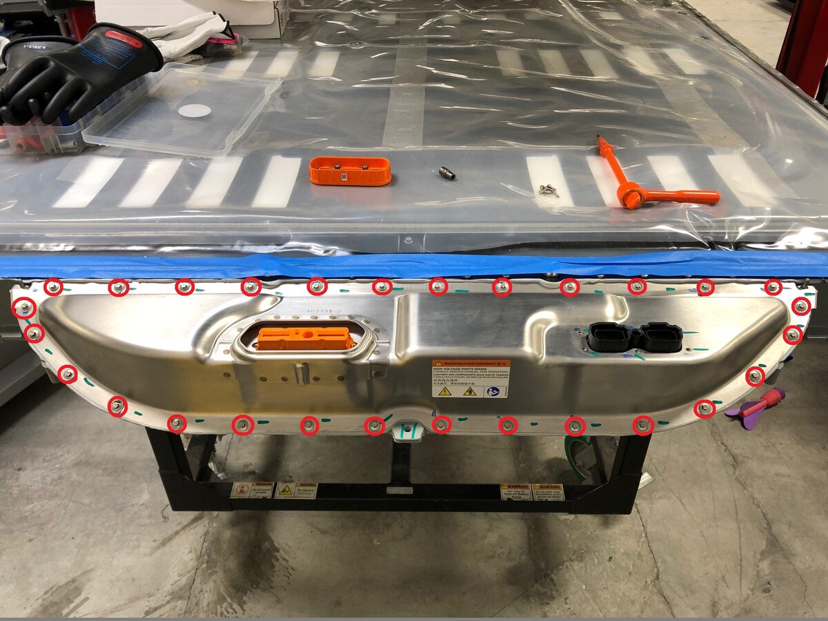 Loosen the front HV battery bolts (x4). After all 4 bolts have been loosened, use a battery powered drill to remove and discard the bolts.