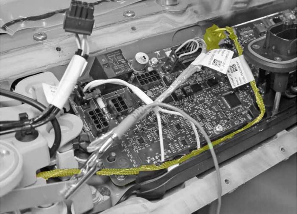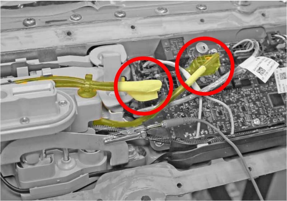 - Route the pack contactor harness through the inboard groove of the LV Rapid Mate bracket, and then connect the pack contactor harness to the ancillary tray circuit board connector. Perform a “push-pull-push” check at the connector to make sure that it is properly secured.