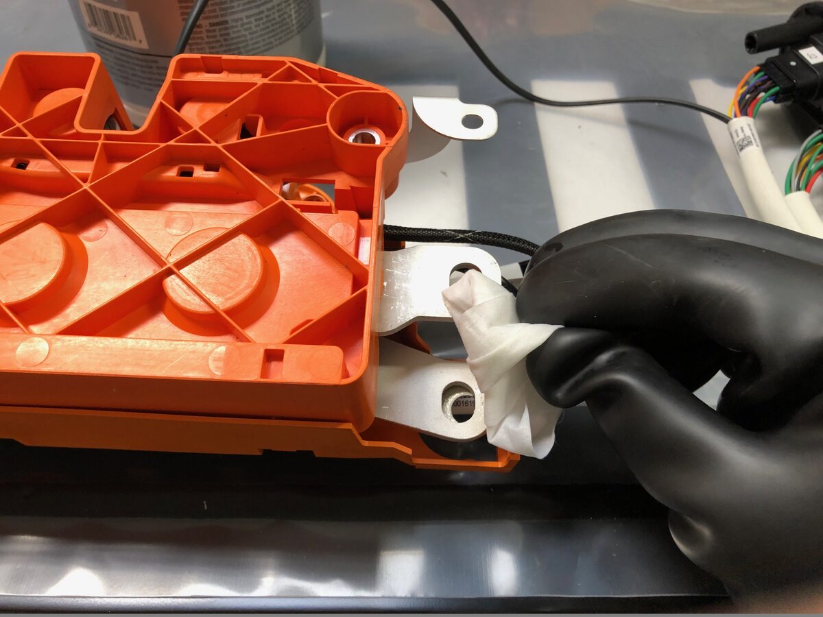 - Use an alcohol wipe to clean the bottom of the HV terminals and the ground busbar on the new ancillary unit.