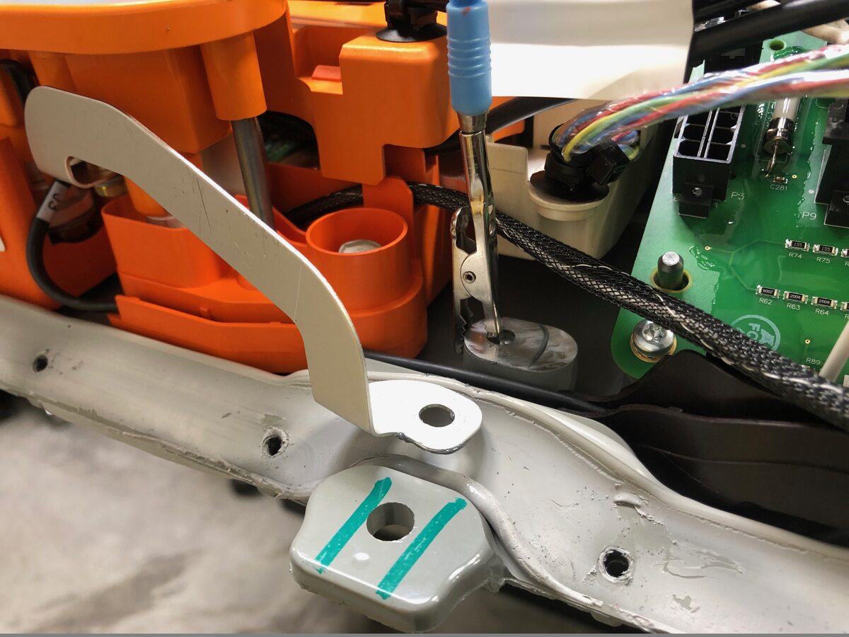 - Unclip the HV-safe static control wrist strap ground connection from the busbar. Move the busbar out of the way and clip the ground connection to the bolt hole in the mounting boss.