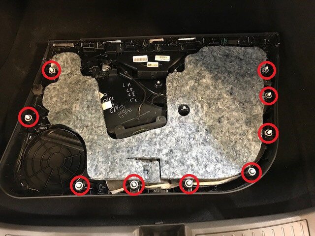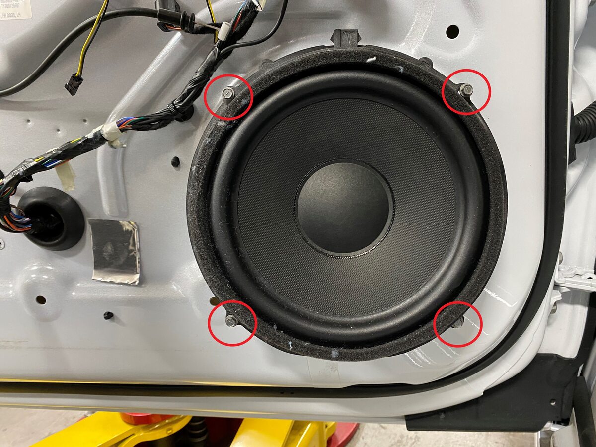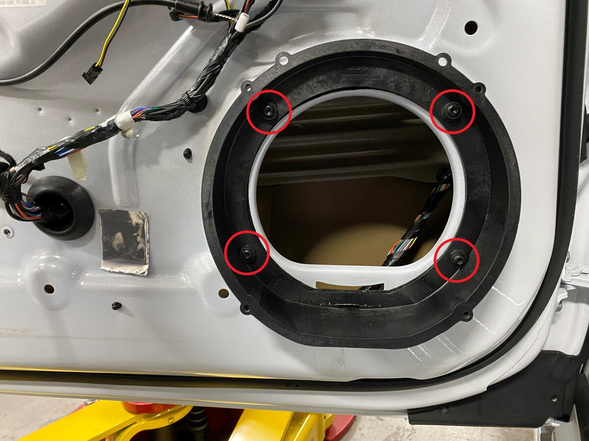 - Remove the screws (x4) that attach the LH front door speaker to the spacer ring.