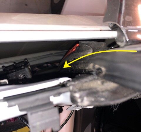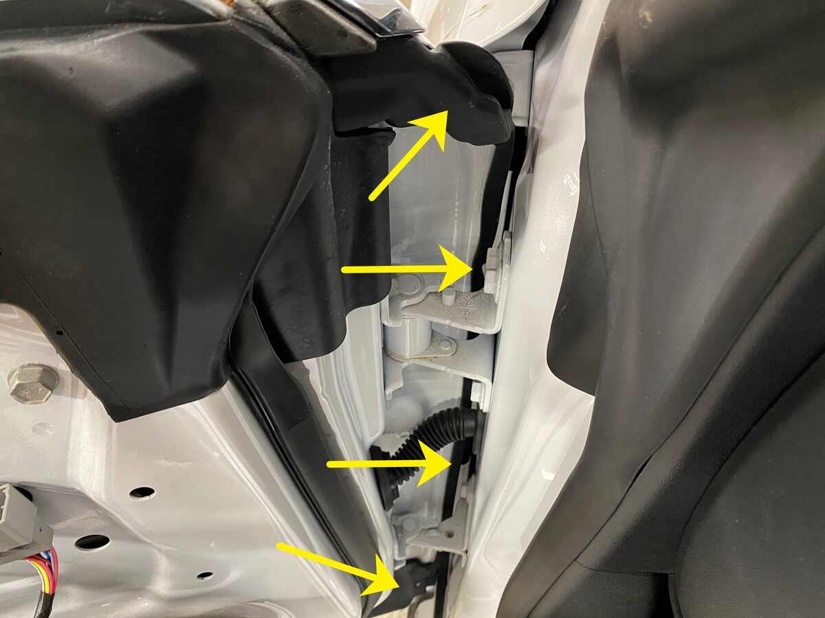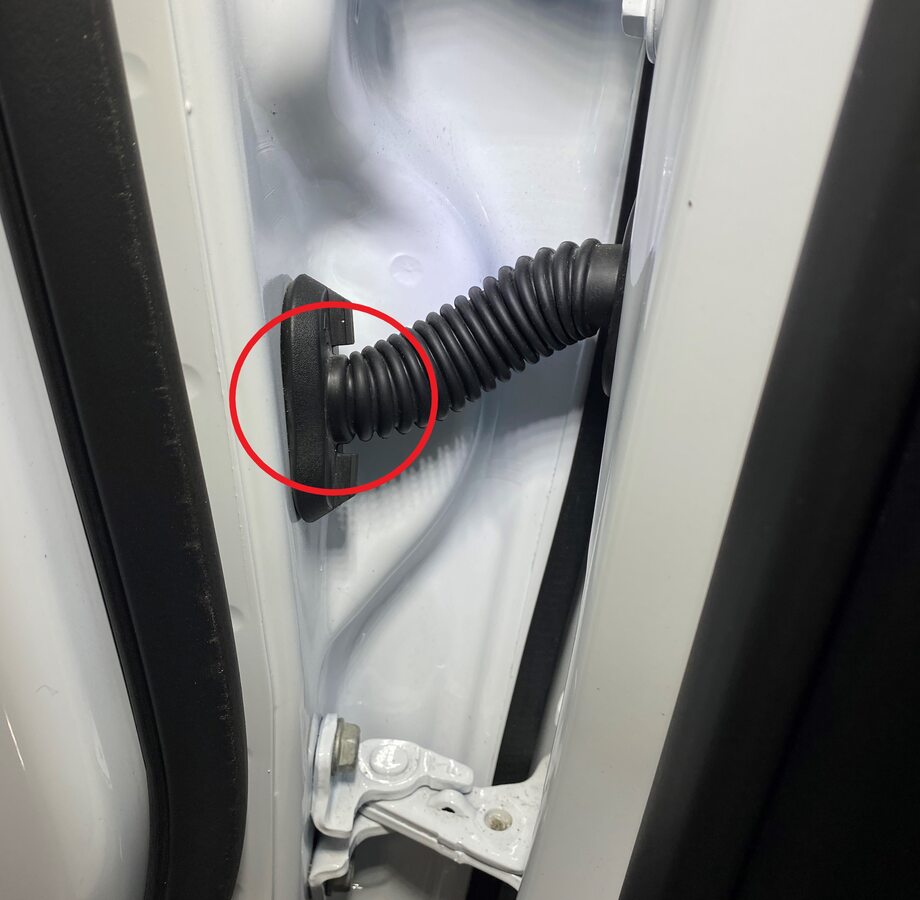 - Remove the clip on the door flap seal to gain access to the exterior mirror assembly bolts.