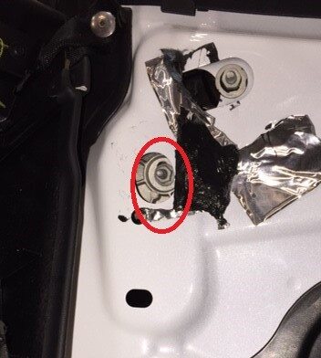 - Loosen the nut that attaches the LH front window glass to the window regulator.