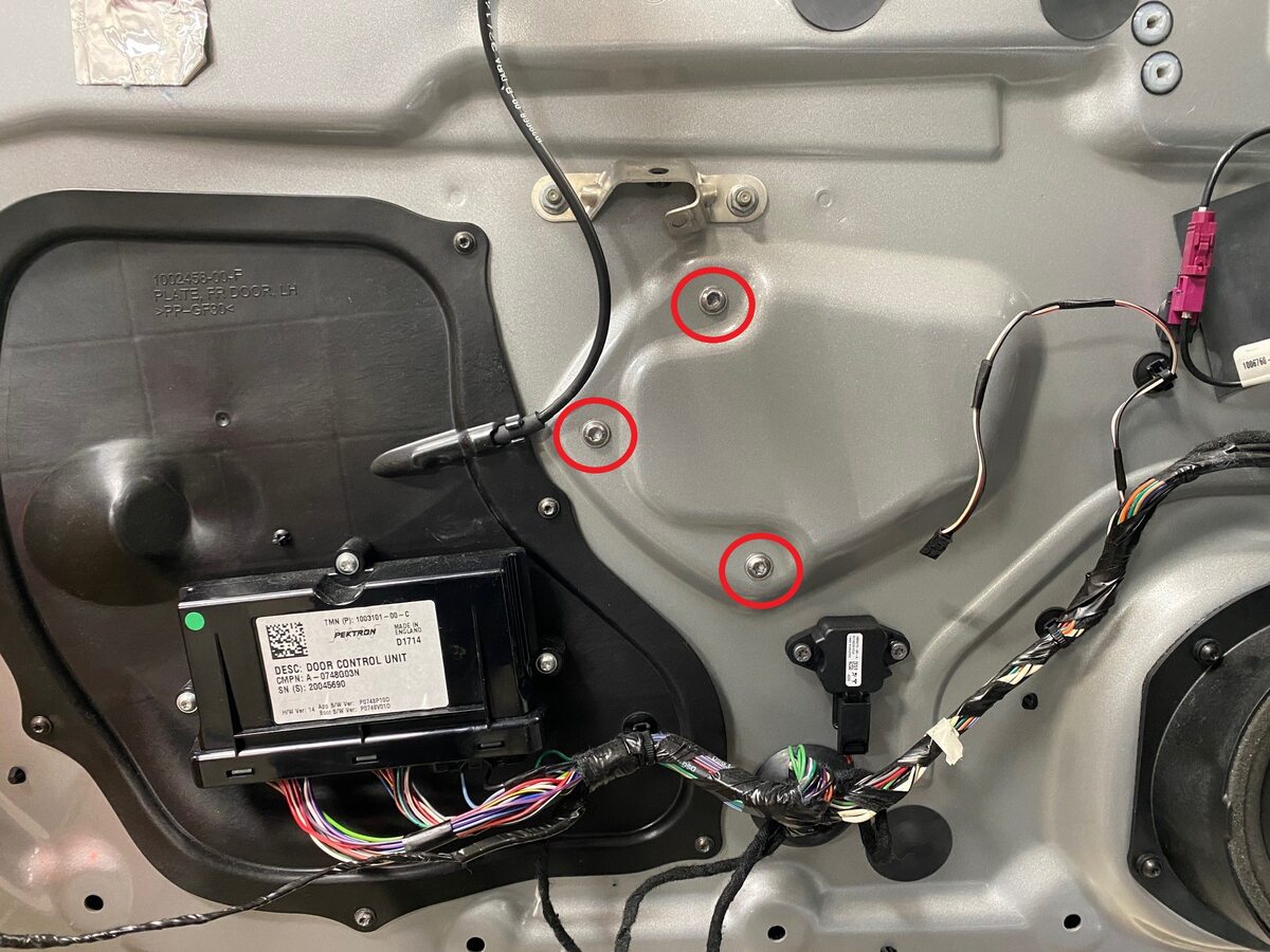 - Install the screws (x4) that attach the LH front door speaker to the spacer ring (torque 1.8 Nm).