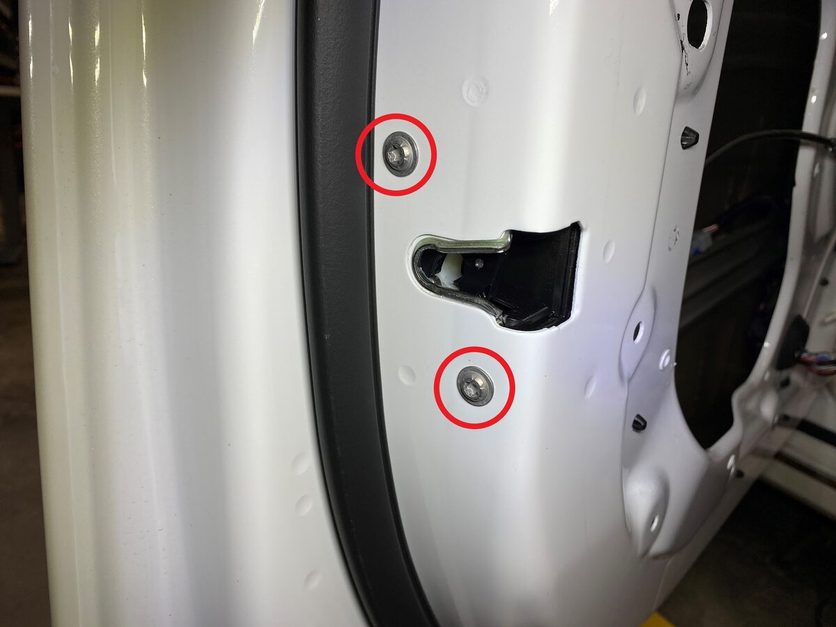 - Install the bolts (x2) that attach the latch to the door assembly (torque 10 Nm).