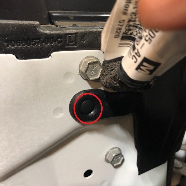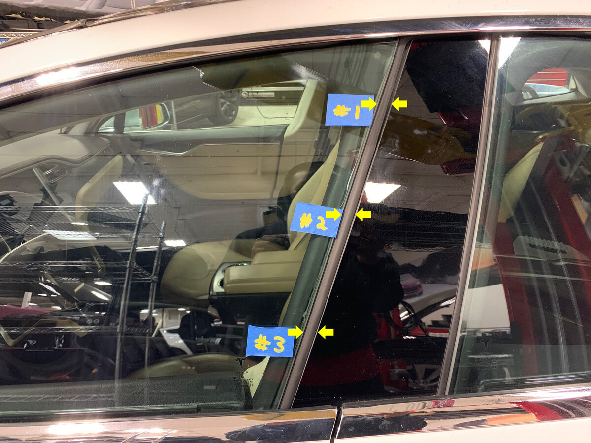 Note1x nut, 10mm, 7.5 Nm. Measure at the end of the door seal radius #1, right above the Tesla logo #3, and half way between 1 and 3.
