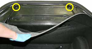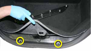 - Peel back the carpeting at the rear of the underhood storage unit. Release the bolts (x2) (torque 8 Nm).