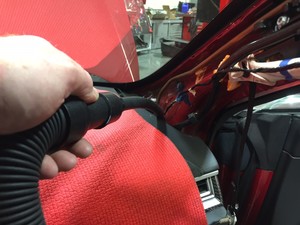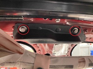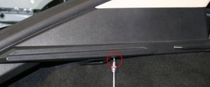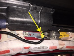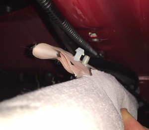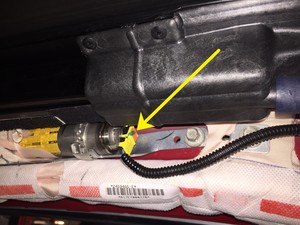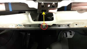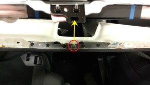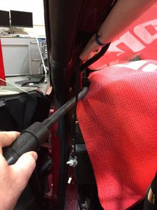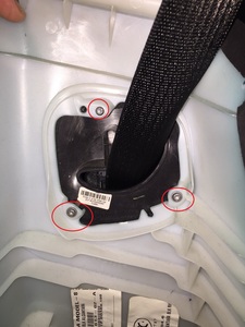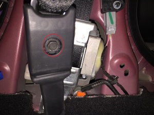 - Remove plastic grommet that covers the fastener anchoring the RH seat belt to the pre-tensioner.