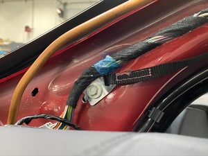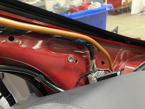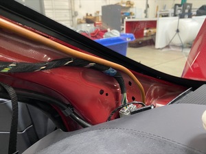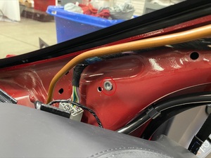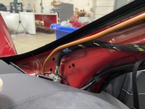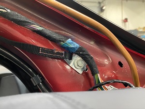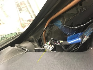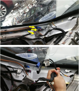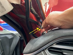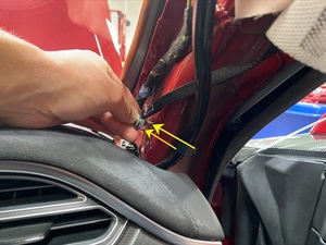 Reconnect headliner harness at LH A-pillar and secure in guide channel