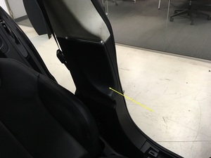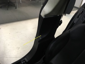 Note6x plastic clips to body, 2x metal clips to upper B-pillar, Replace any damaged or missing clips, Lift the trim to clear the seat and pre-tensioner