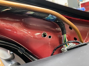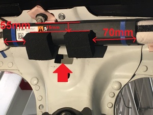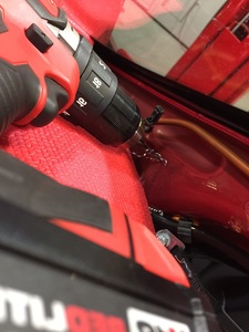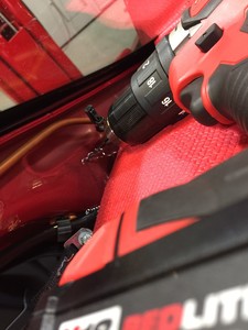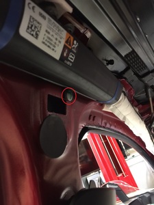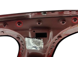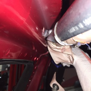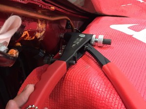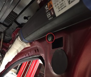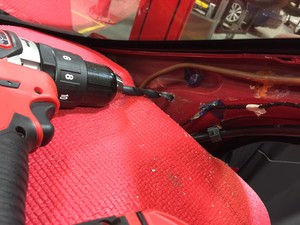 Drill a 10mm hole in the LH A pillar for rivnut installation and a 4 mm hole for the locating pin