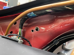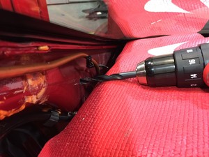 Drill a 10mm hole in the RH A pillar for rivnut installation and a 4 mm hole for the locating pin