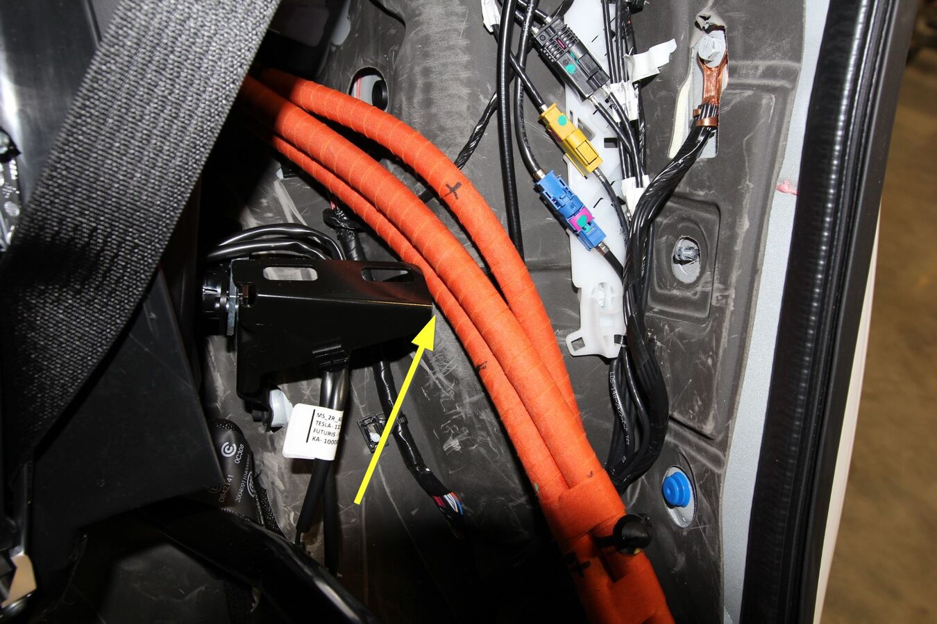 - Feed the charge port assembly through the trunk area of the vehicle to pass the harnesses through between the seat pivot and body.