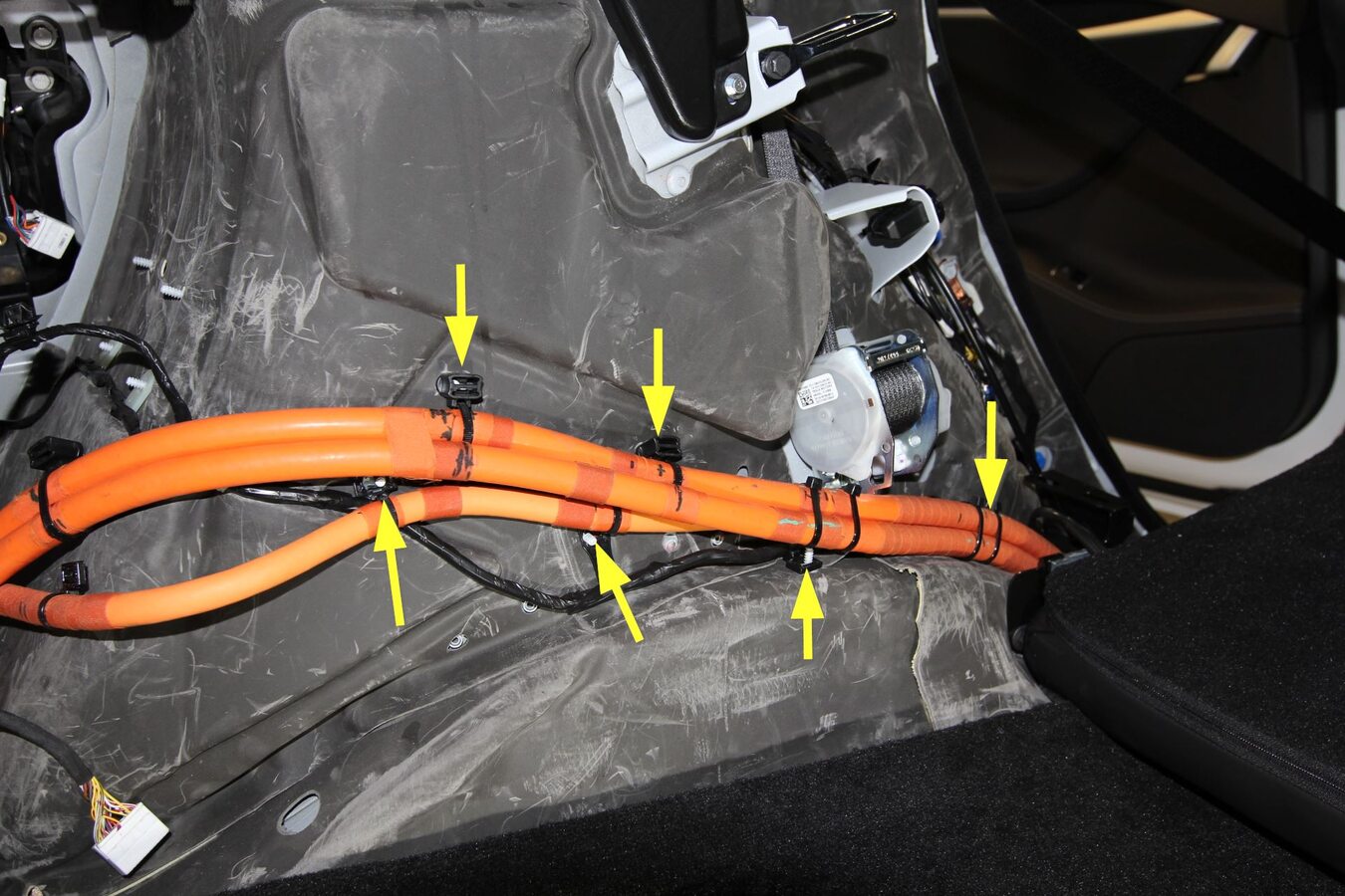 - Release the clips (x6) that attach the HV harnesses to the LH rear of the body.