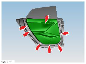 - Remove the screws that secure the trim pad to the door. Note that two screws are concealed by the door handle cover (torque 3 Nm) and one screw is concealed by the pull cup's rubber insert (torque 6 Nm).