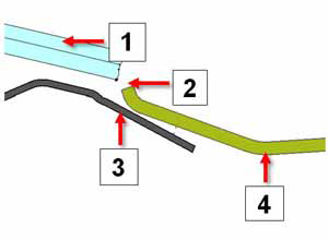1 Moving glass fully closed 2 1.5 - 2 mm 3 Latching tab 4 Bracket - If no bracket is present, bend the latching tab so that it is
